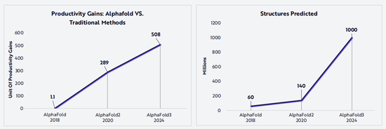 以AlphaFold为代表的AI模型,在蛋白质结构预测方面取得了突破性进展,其效率是传统方法的508倍。最新版本AlphaFold3可以预测超过10亿种结构,包括多链复合物、蛋白质-配体、蛋白质-DNA/RNA相互作用等。