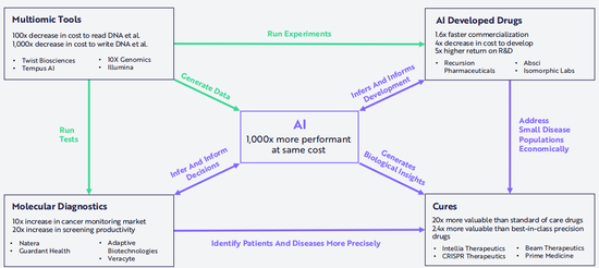 ARK指出,多组学在AI技术的支持下,正在改变医疗诊断、药物研发和治疗方法,能够通过生成数据、运行测试、推断和决策,以及运行实验来推断和指导开发,从而经济有效地解决小疾病人群的问题,并更精准地识别患者和疾病。
